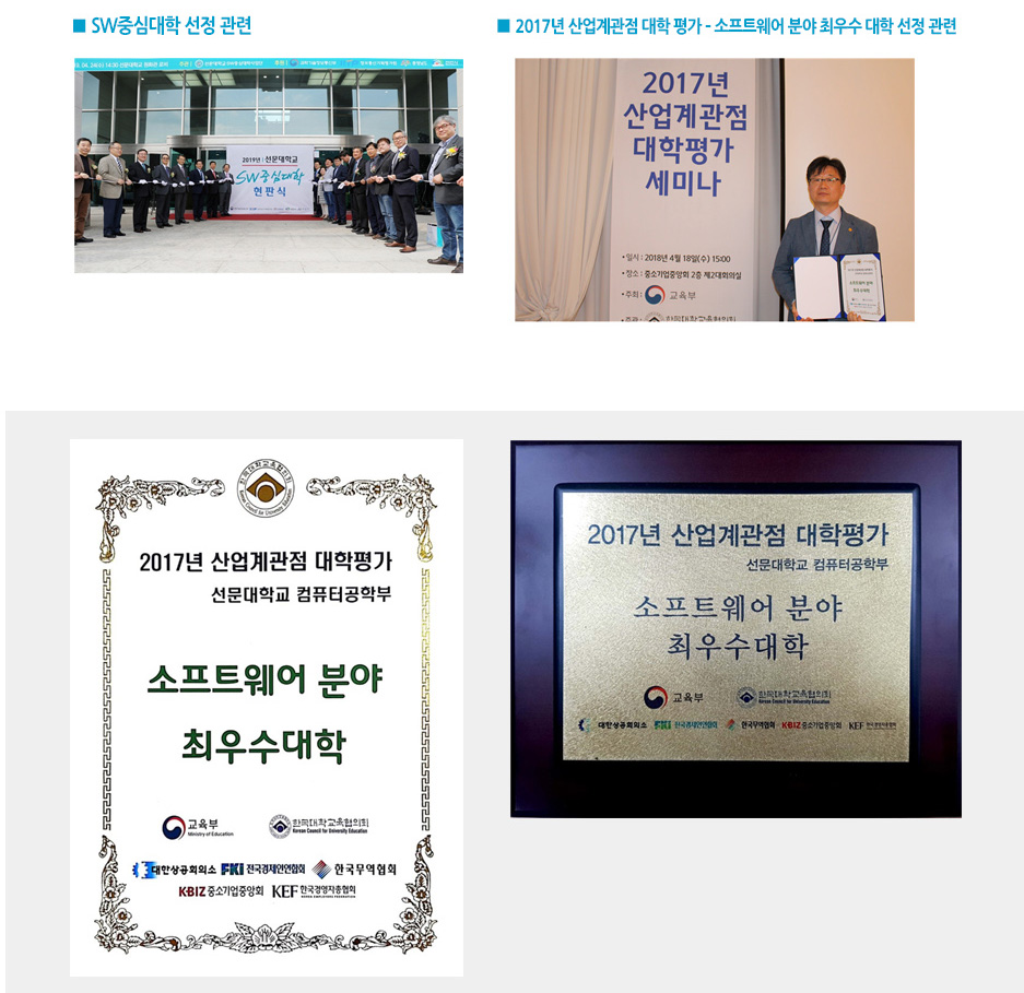 이와 같은 정부 지원을 통해 실전적이고 미래지향적인 형태로 교육과정을 지속적으로 개선해나가고 있습니다. 이러한 노력으로 2017년 산업계 관점 대학 평가에서 SW분야 최우수 대학으로 선정되었습니다.