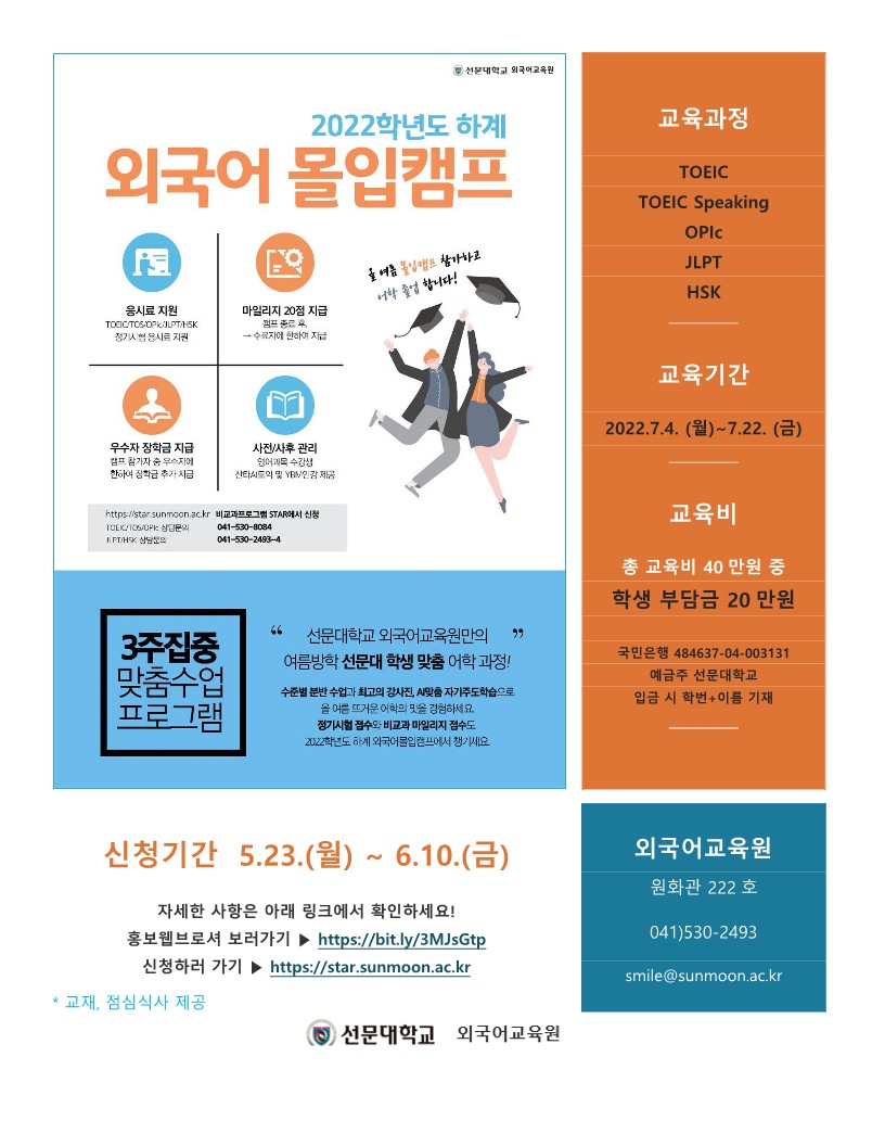 2022 하계방학 외국어 몰입캠프(토익/토익스피킹/오픽/JLPT/HSK) 모집 안내